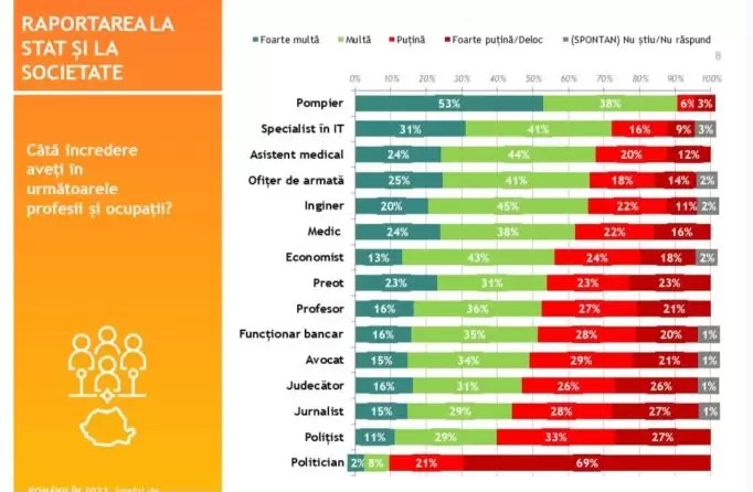 Potrivit studiului sociologic, atunci când au fost invitați să indice nivelul de încredere pe care îl au față de 15 profesii, cei mai mulți dintre respondenți i-au plasat pe scala pozitivă (foarte multă încredere și multă încredere) pe pompieri (91%: =), pe specialiștii în IT (62%: -15%), pe asistenții medicali (68%: -1%), pe ofițerii de armată (66%: =) sau pe ingineri (65%: -4%). Sunt urmați de medici (62%: +3%), de economiști (56%: +1%), de preoți (52%: -7%), de profesori (52%: -7%) și de funcționari bancari (51%: -4%). Românii îi plasează în topul încrederii, pe ultimele poziții, pe avocați ( 49%: +1%), judecători (47% =), jurnaliști (44% =), polițiști (41%: +1%). Pe ultimul loc se află politicienii, doar unul din zece români declarând că are multă și foarte multă încredere în aceștia. De altfel, ierarhia nu s-a schimbat în mod semnificativ în ultimul an, chiar dacă unele profesii se situează mai jos în topul încrederii, procentele sunt foarte apropiate cu cele înregistrate la sondajul similar din decembrie 2022.