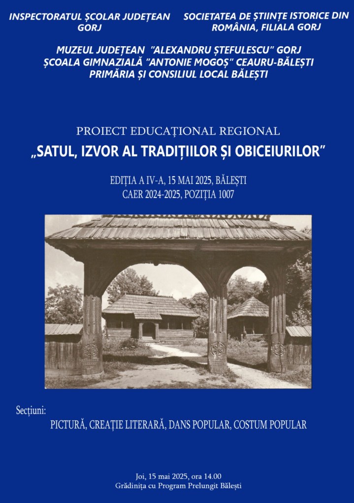 Sute de elevi din mai multe județe s-au înscris în acest an să participe la Concursul Regional “Satul, izvor al tradițiilor și obiceiurilor”, proiect educațional găzduit recent de Grădinița cu Program Prelungit Bălești, unitate de învățământ arondată Școlii Gimnaziale „Antonie Mogoș” Ceauru , Bălești în parteneriat cu Inspectoratul Școlar Județean Gorj, Muzeul Județean „Alexandru Ștefulescu” Gorj, Societatea de Științe Istorice din România – Filiala Gorj, Primăria și Consiliul Local Bălești.